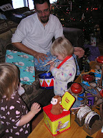 Santa came! Candy, oranges, a purple/blue car, purple/blue cup and purple/pink hair clips for our girls-- they must have been very good this year. Note: according to my sample size of two, letting your 2 year old eat an entire candy cane before breakfast is not good for her digestion.
